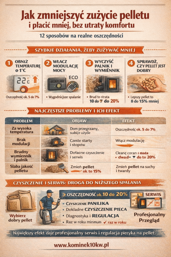 Dlatego, gdy pytasz jak zmniejszyć zużycie pelletu, odpowiedź bardzo często brzmi: serwis i regulacja.