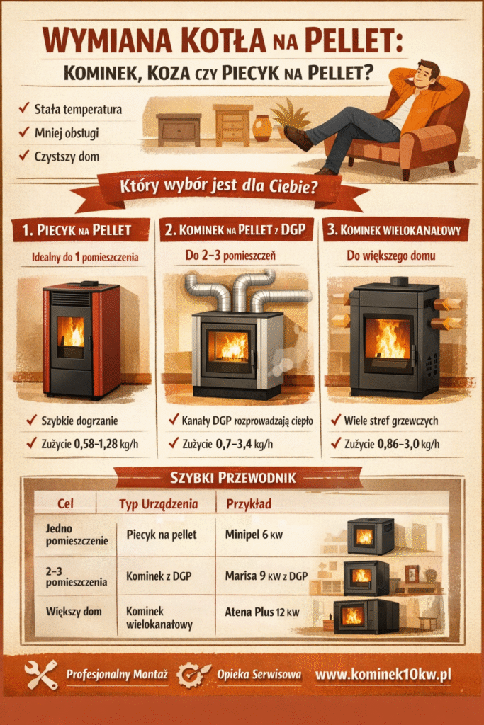 Wymiana kotła na pellet ma sens, gdy chcesz stabilnej temperatury i mniej codziennej obsługi. Najprościej dobrać rozwiązanie pod liczbę stref: do jednego pomieszczenia sprawdza się piecyk na pellet typu Air z nadmuchem, który szybko podnosi temperaturę. Gdy ciepło ma dojść dalej niż salon, wybierz kominek na pellet z DGP i zaplanuj kanały tak, żeby nie tracić energii po drodze. W większym domu, gdzie liczy się kontrola i zasięg, najlepszy bywa mocniejszy kominek z DGP lub wersja wielokanałowa. Klucz to dobór mocy, rozsądny projekt, profesjonalny montaż, uruchomienie i ustawienia pod Twój dom. Jeśli chcesz, zrobimy to od A do Z, razem z opieką serwisową.