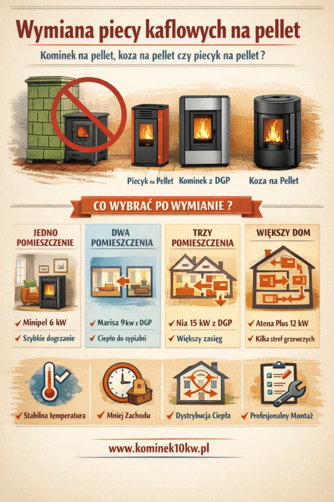 Wymiana piecy kaflowych na pellet ma sens wtedy, gdy chcesz stabilnej temperatury i mniej codziennej pracy. Najprostszy wybór wygląda tak: