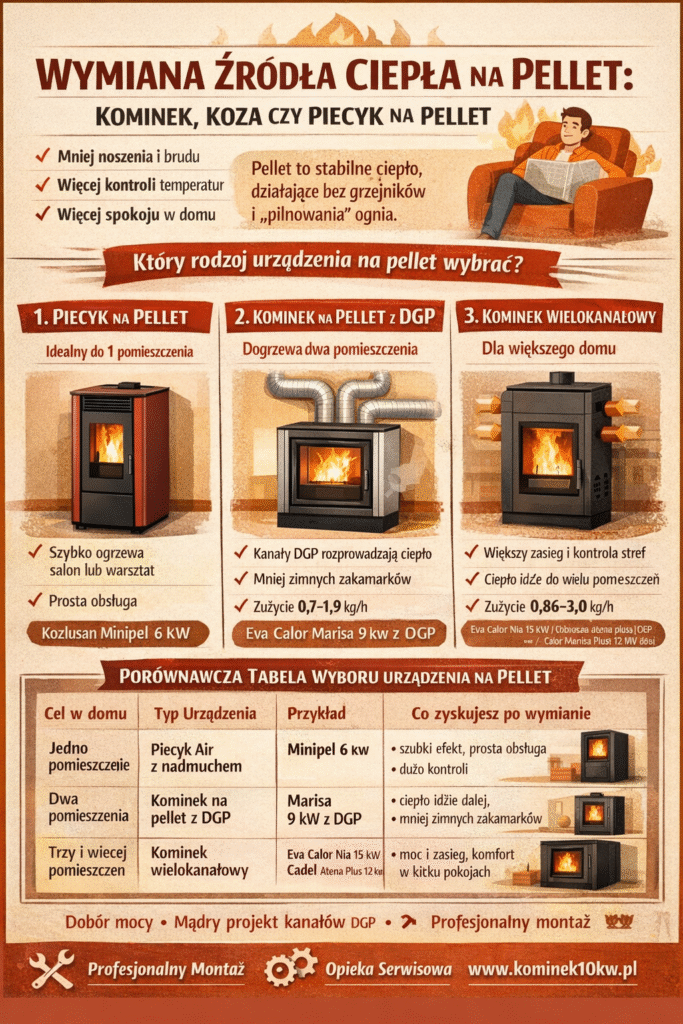 Kominek10kw.pl zajmuje się wyłącznie kominkami na pellet, kozami na pellet i piecykami na pellet oraz ich montażem w całej Polsce. Tu nie ma dygresji o innych źródłach ogrzewania. Jest konkret: pellet, komfort, dobór i serwis.